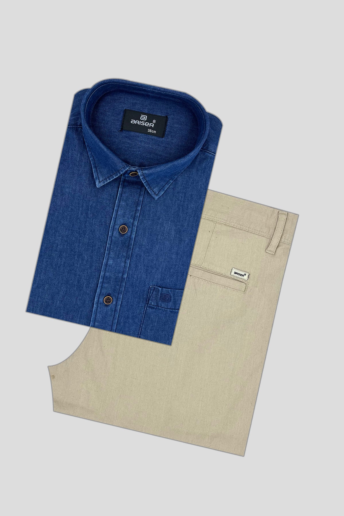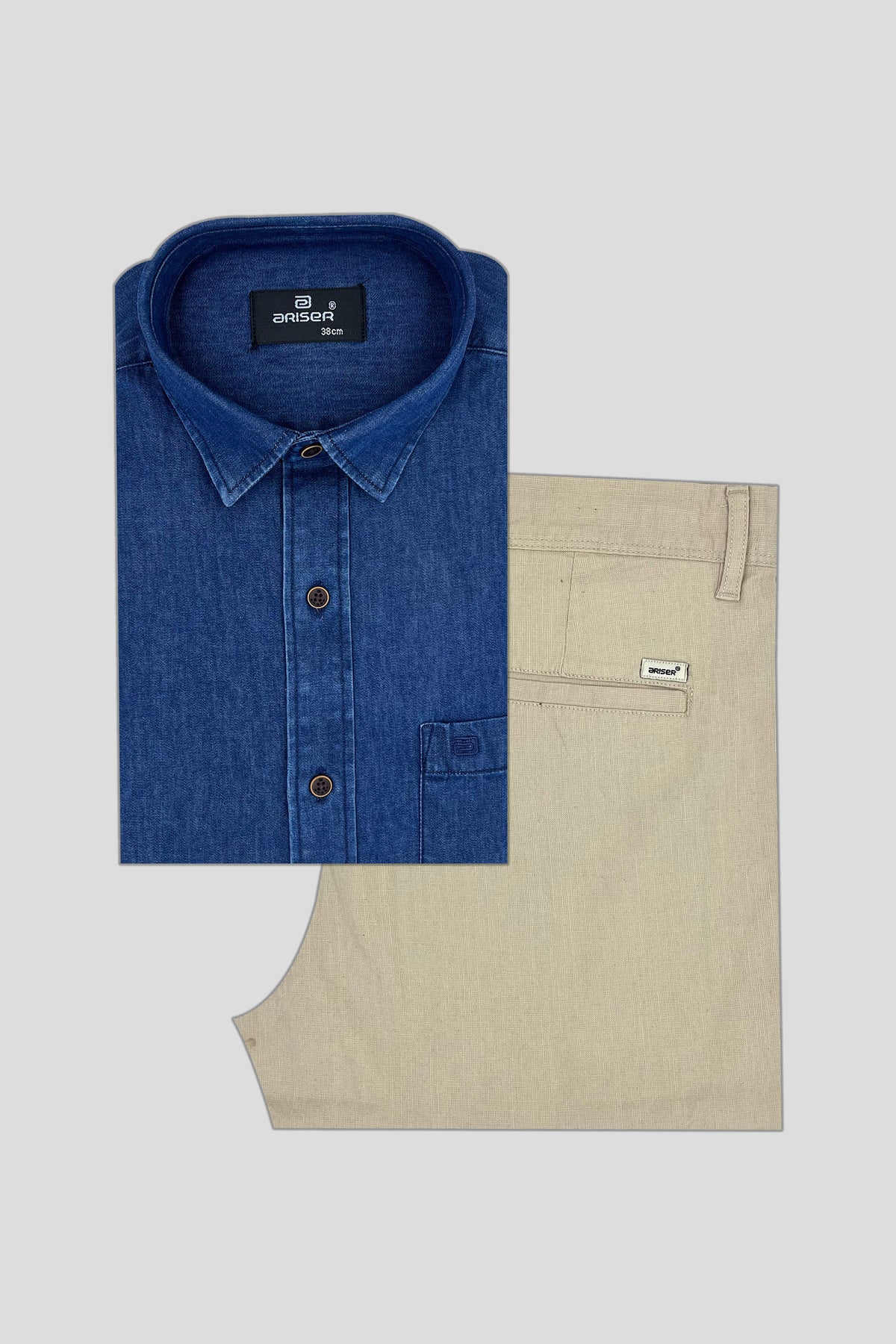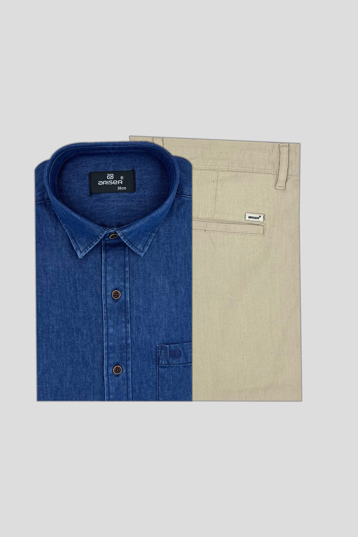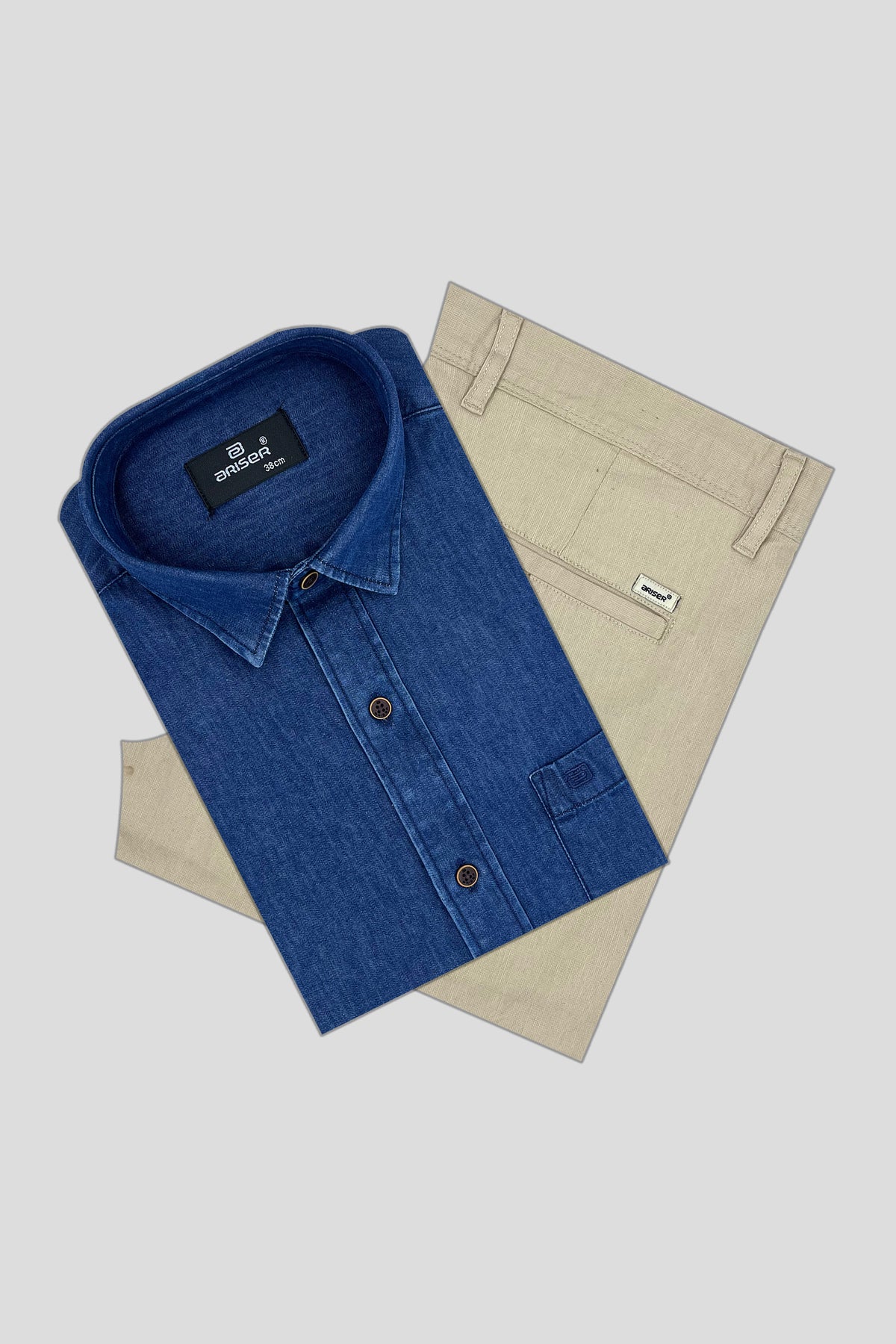 The Denim + Kansas - Dark Blue Shirt With Cream White Trouser Combo For Men | Ariser offers a classic and sophisticated look, perfect for both formal and semi-formal occasions. Well-structured for a modern, polished look. Shirts is crisp Dark Blue, tailored for a sharp and elegant fit, offering a timeless appeal. Trouser comes stylish colors, designed for comfort and versatility, complementing the Dark Blue shirt.