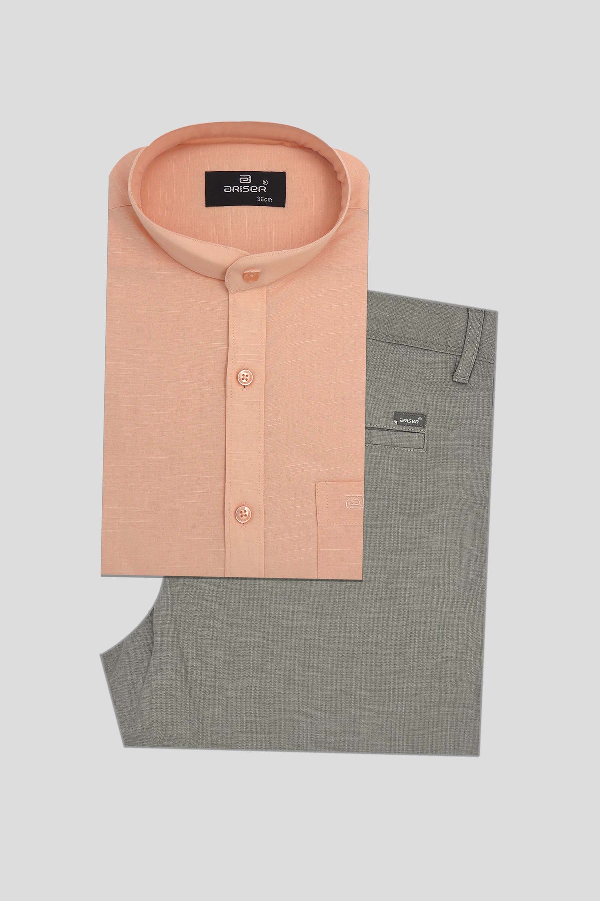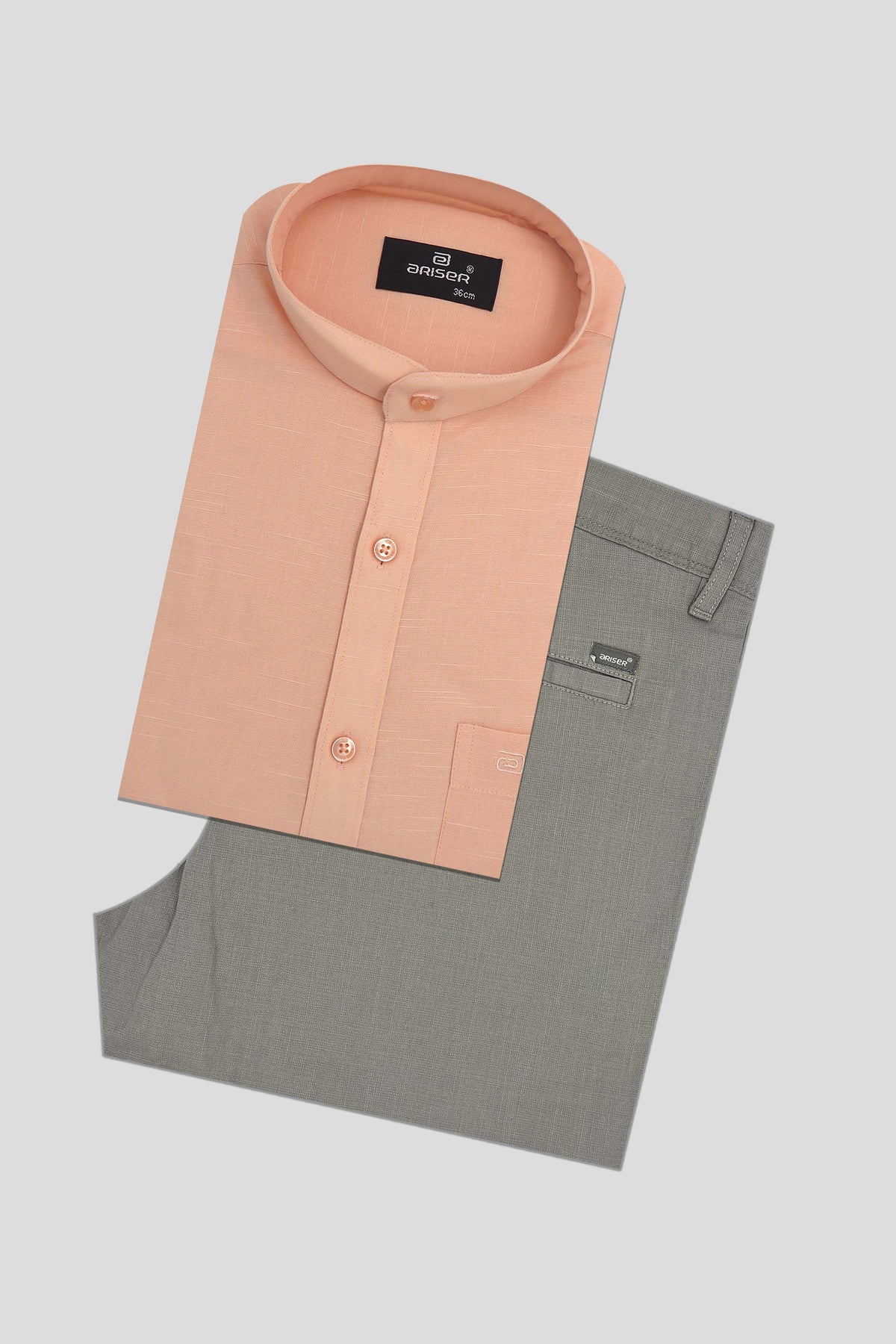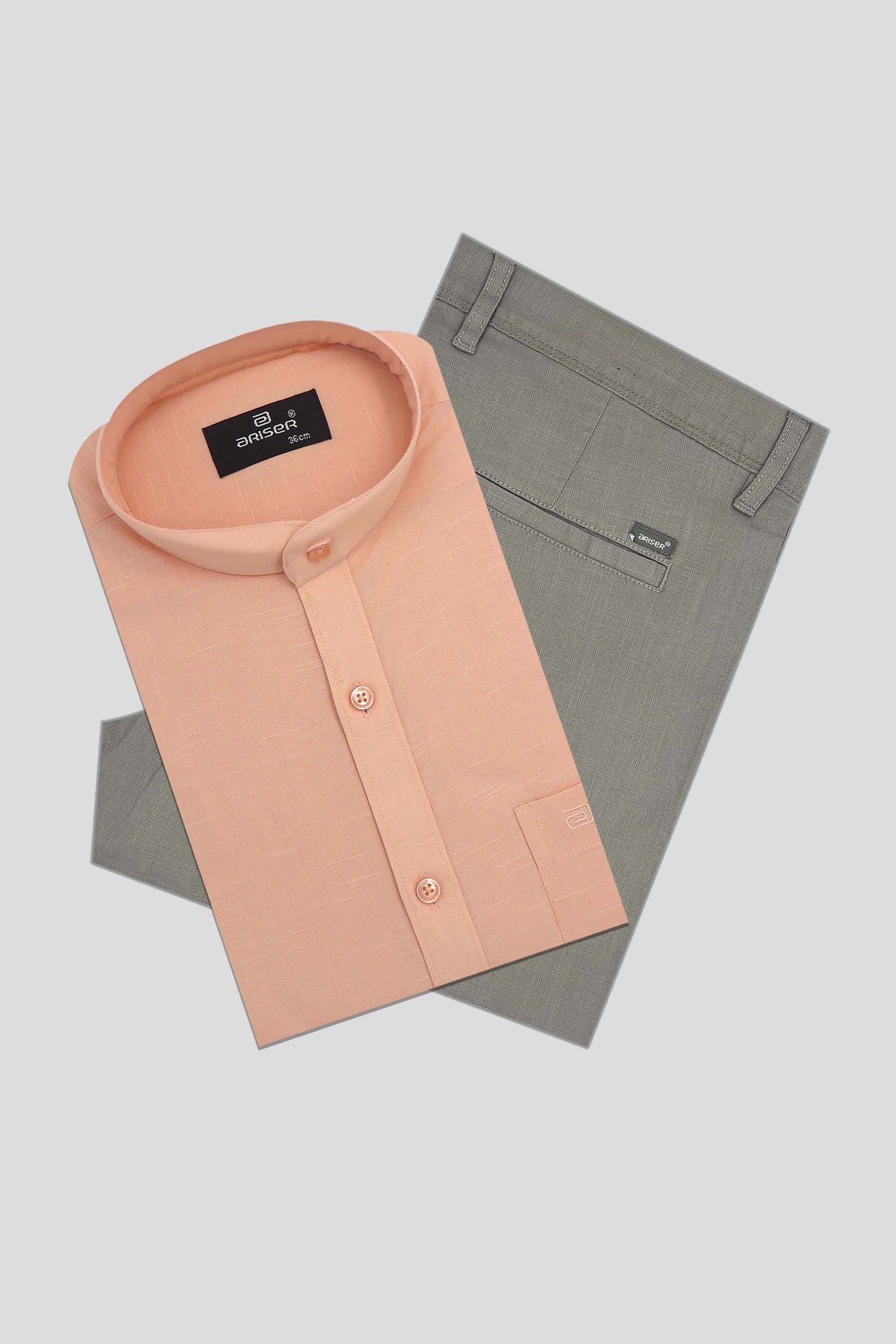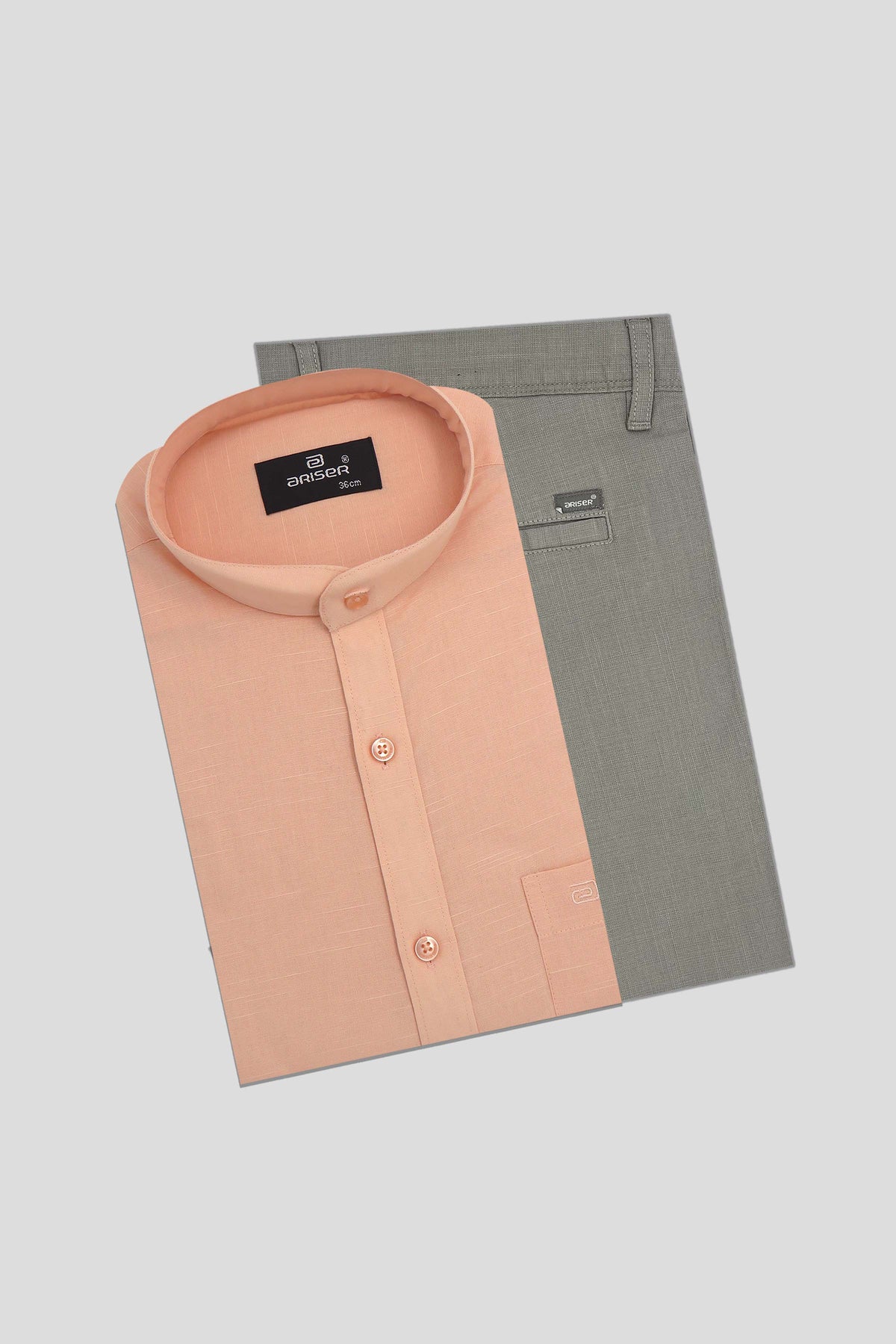The Neo + Kansas - Light Orange Shirt With Stone Gray Trouser Combo For Men | Ariser offers a classic and sophisticated look, perfect for both formal and semi-formal occasions. Well-structured for a modern, polished look. Shirts is crisp Light Orange, tailored for a sharp and elegant fit, offering a timeless appeal. Trouser comes stylish colors, designed for comfort and versatility, complementing the Light Orange shirt.