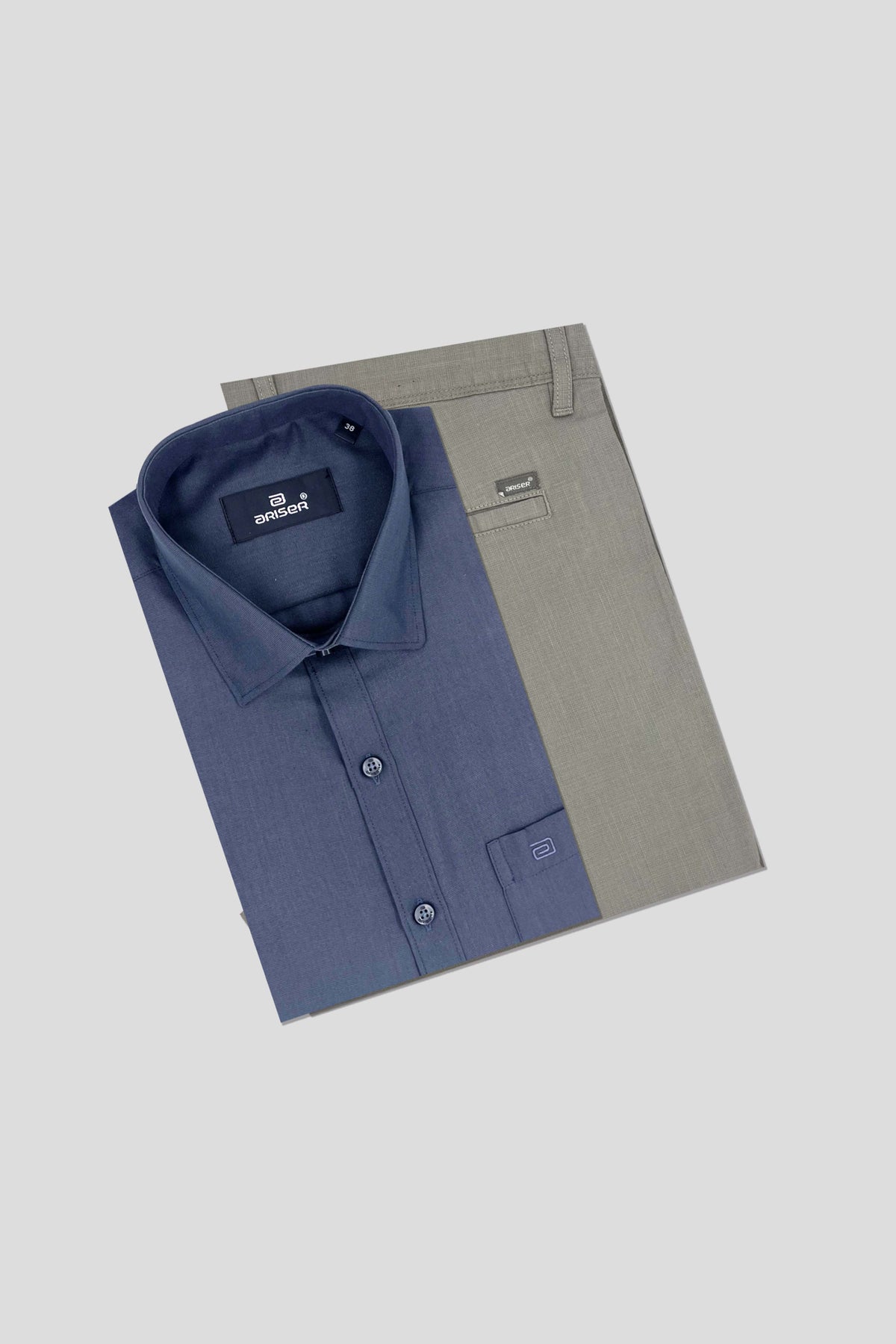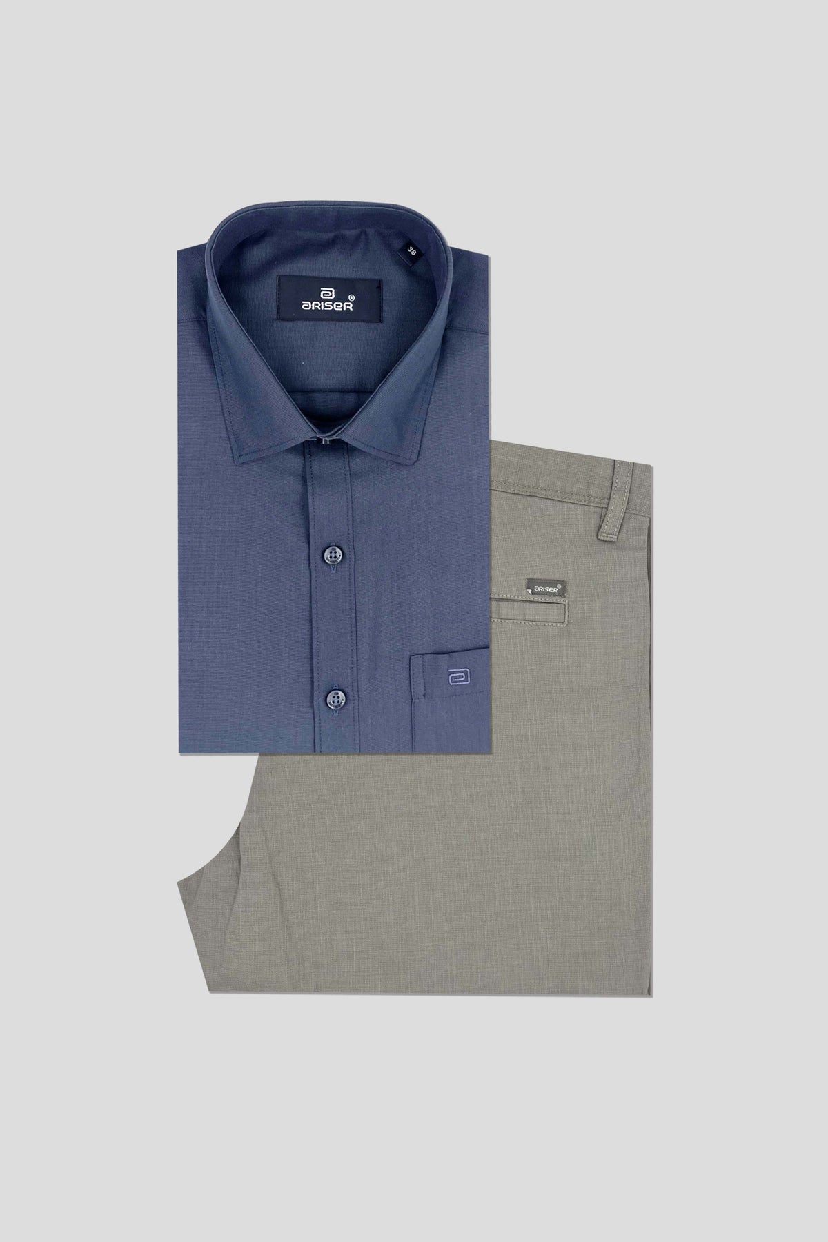The Super Soft + Kansas - Navy Blue Shirt With Stone Gray Trouser Combo For Men | Ariser offers a classic and sophisticated look, perfect for both formal and semi-formal occasions. Well-structured for a modern, polished look. Shirts is crisp Navy Blue, tailored for a sharp and elegant fit, offering a timeless appeal. Trouser comes stylish colors, designed for comfort and versatility, complementing the Navy Blue shirt.