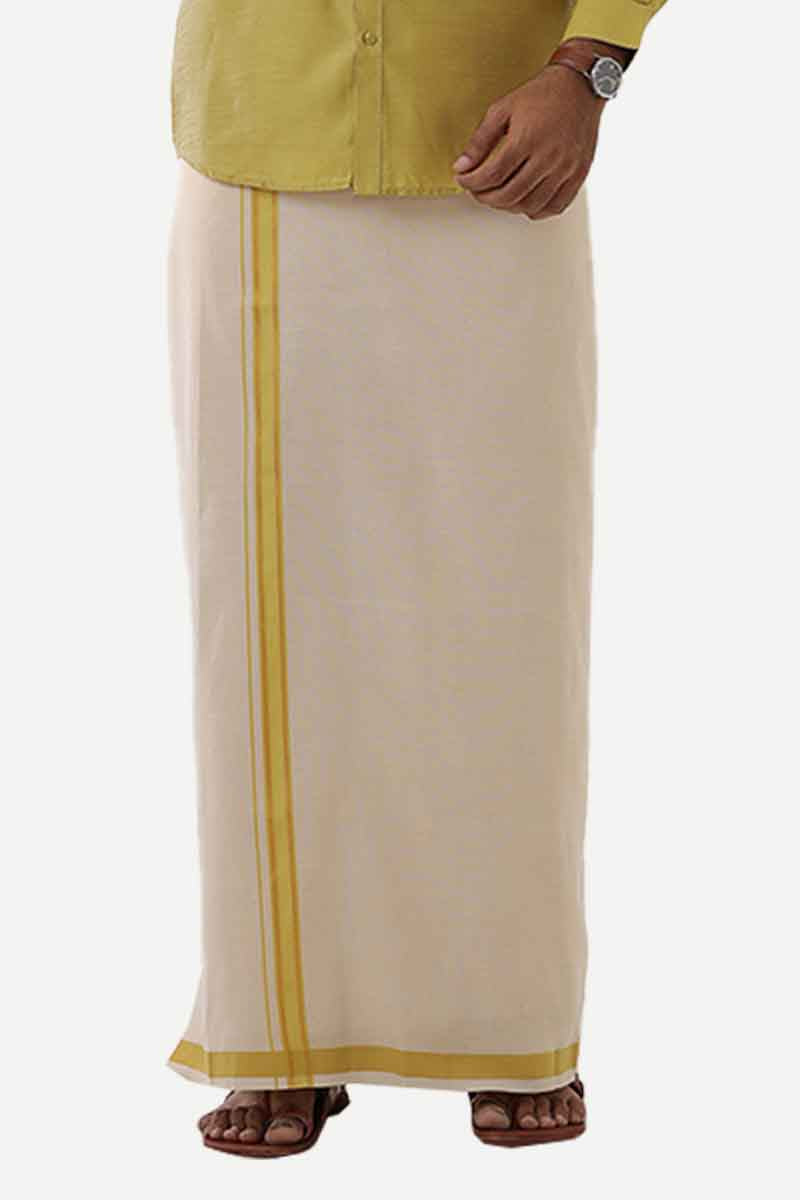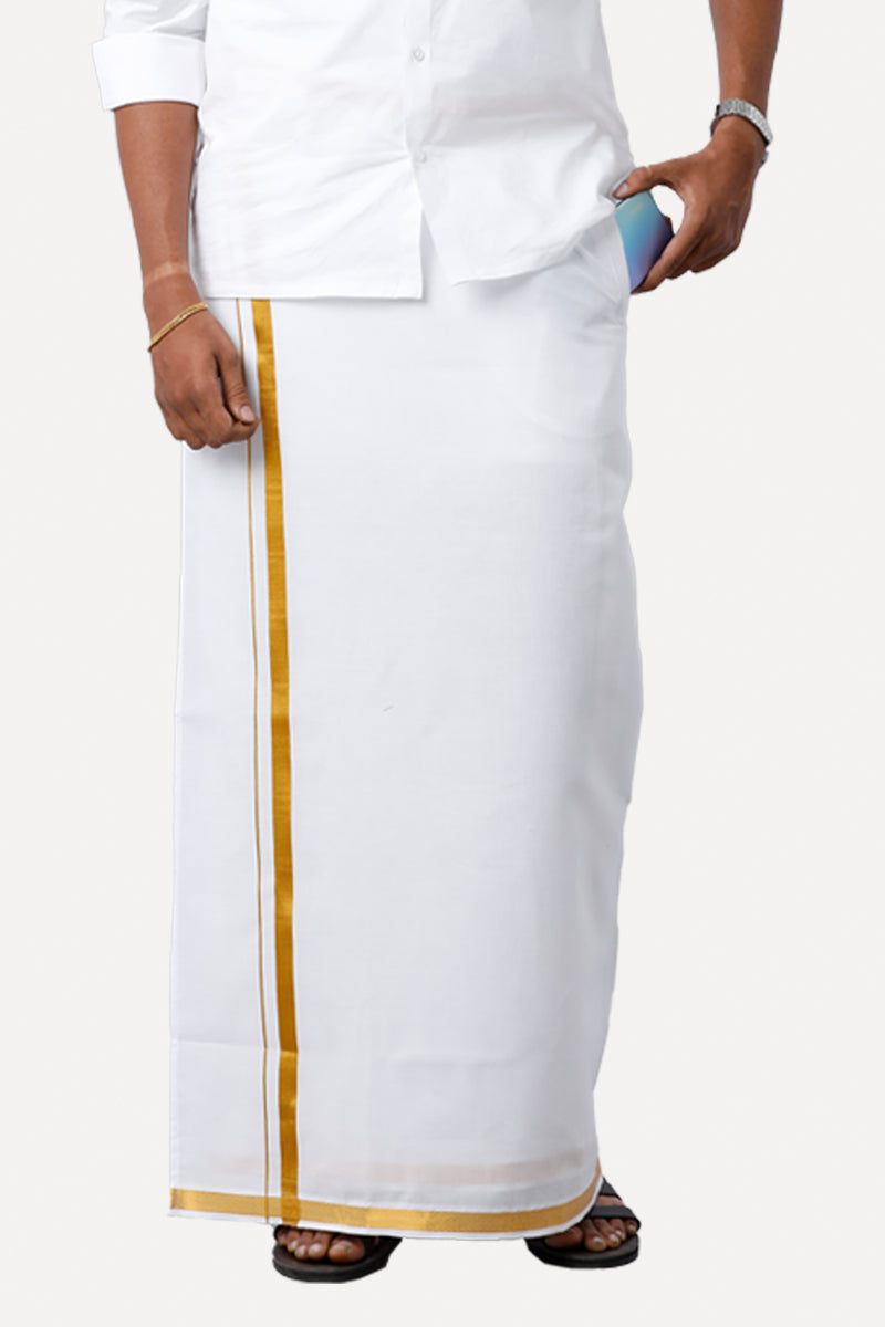 The minister's white dhoti is classic, simple, and elegant. Perfect for formal events and ceremonies, the minister's white dhoti represents purity and grace. At Uathayam, we take pride in offering the finest minister white dhotis, crafted to perfection for the discerning gentleman. Choosing a minister white dhoti from Uathayam ensures you are always dressed appropriately for any formal occasion. Its timeless appeal makes it a wardrobe essential for every man.