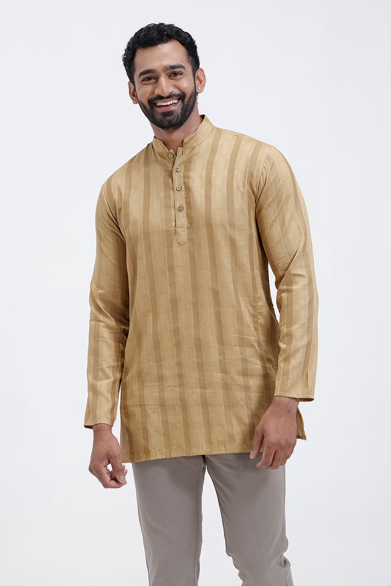Elevate your traditional wardrobe with the Leno Men’s Kurta in Mustard Gold from Uathayam. Crafted from a breathable and comfortable fabric, this kurta features subtle vertical woven patterns that add refined texture and elegance. Designed with a classic mandarin collar and full-length sleeves, it offers a timeless silhouette suitable for festive occasions, cultural celebrations, and casual traditional wear.