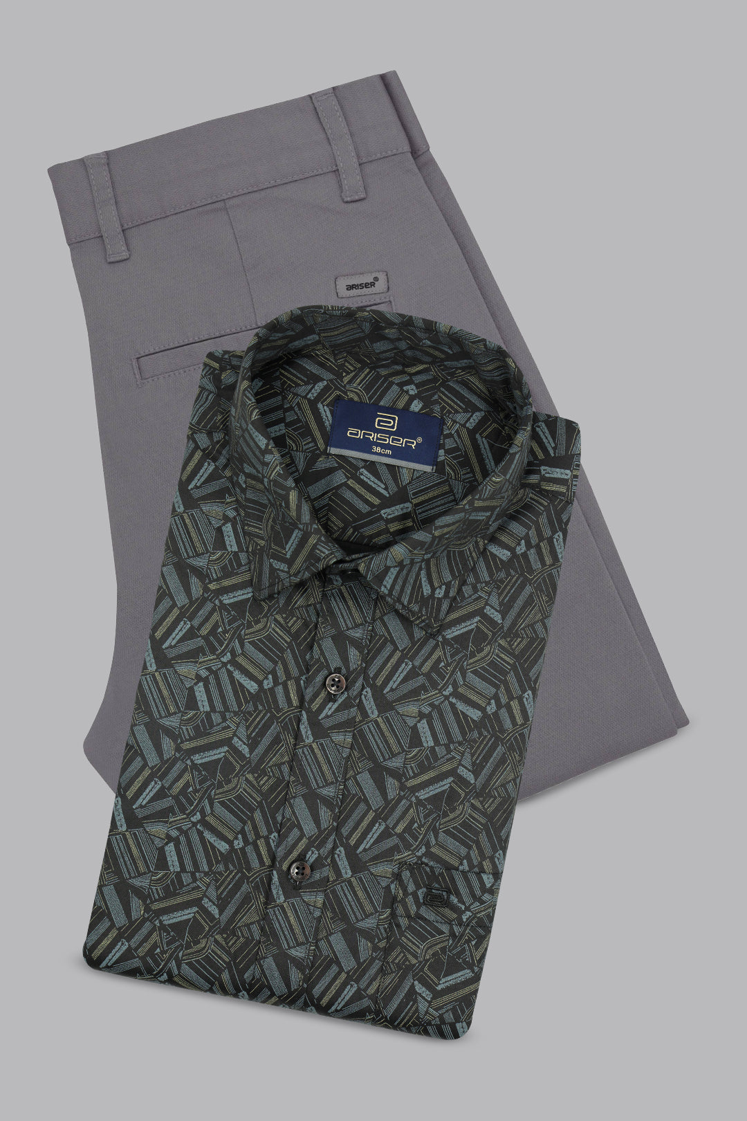 The Vudu + Monaco - Dark Charcoal Grey Printed Shirt With Gray Trouser Combo For Men offers a refined and contemporary look, perfect for both formal and semi-formal occasions. Expertly tailored for a modern, polished appearance, the dark charcoal grey printed shirt delivers a sharp and sophisticated style with a sleek finish. Paired with versatile gray trousers designed for superior comfort and a structured fit, this combo creates a well-balanced, elegant ensemble. Ideal for office wear, business meetings, evening events, or smart casual outings, this set ensures effortless style with lasting comfort.