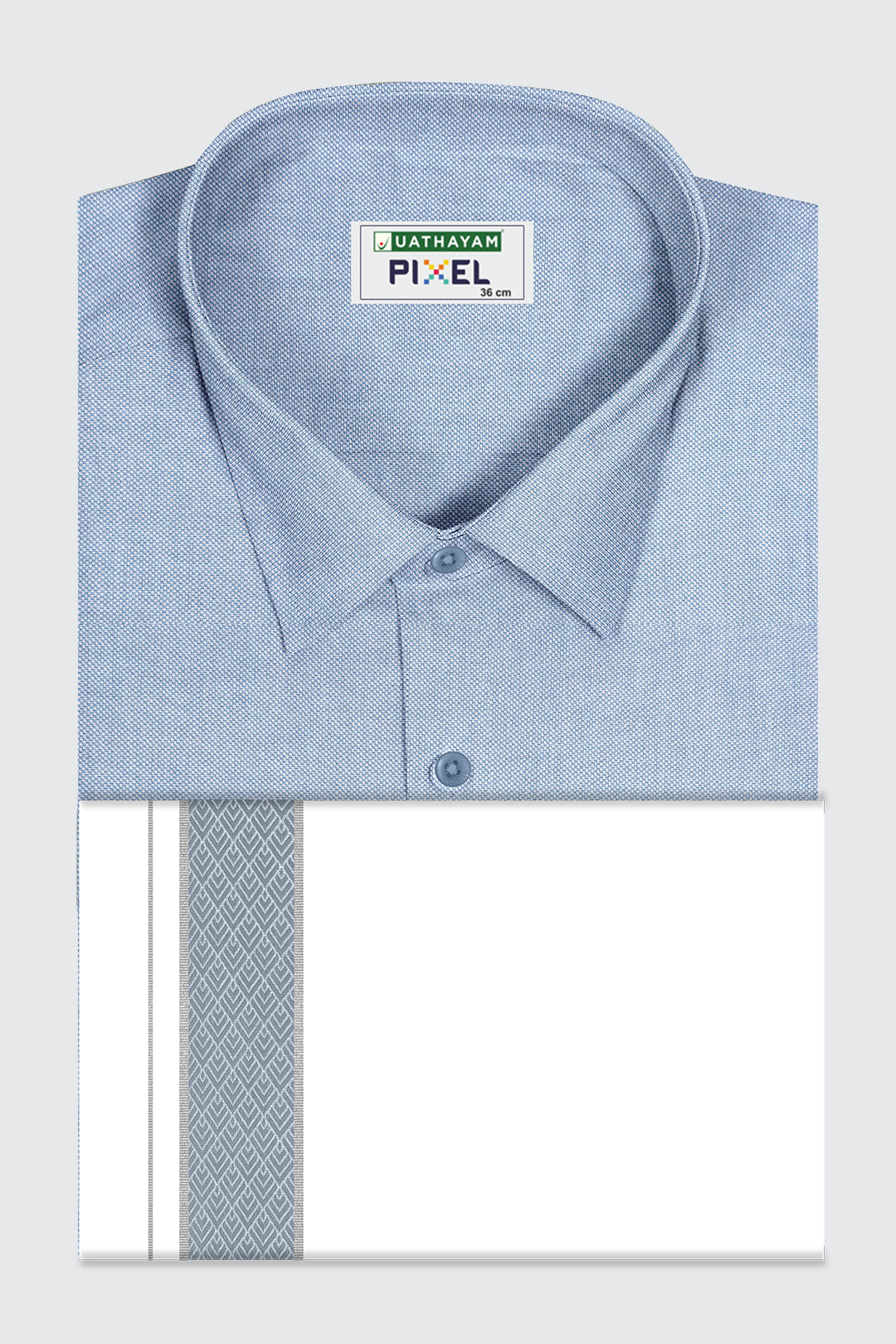 Majestic - Denim Blue Matching Shirt And Single Layered Fancy Border Dhoti Set For Men | Uathayam