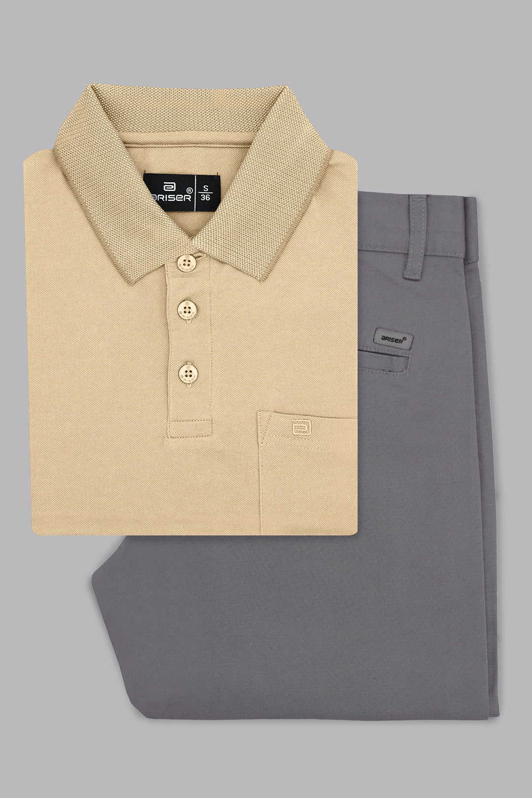The Golf Polo + Monaco Coral Peach T-Shirt with Gray Trouser Combo delivers a smart yet relaxed look, perfect for casual outings and semi-formal settings. The coral peach golf polo T-shirt, made from a cotton-rich blend, offers a modern fit with a sporty, stylish appeal and all-day comfort. Paired with the grey monaco cotton trouser, designed for durability and ease of movement, this combo creates a balanced, versatile outfit ideal for office casuals, travel, or everyday wear.