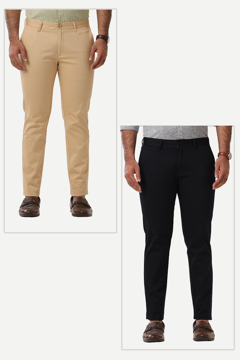 Monaco Trousers for men, featuring with classic colors. Enhance your wardrobe with the Monaco combo pack, featuring two stylish trousers. Made from high-quality cotton, these trousers offer exceptional comfort and breathability, making them perfect for any occasion.