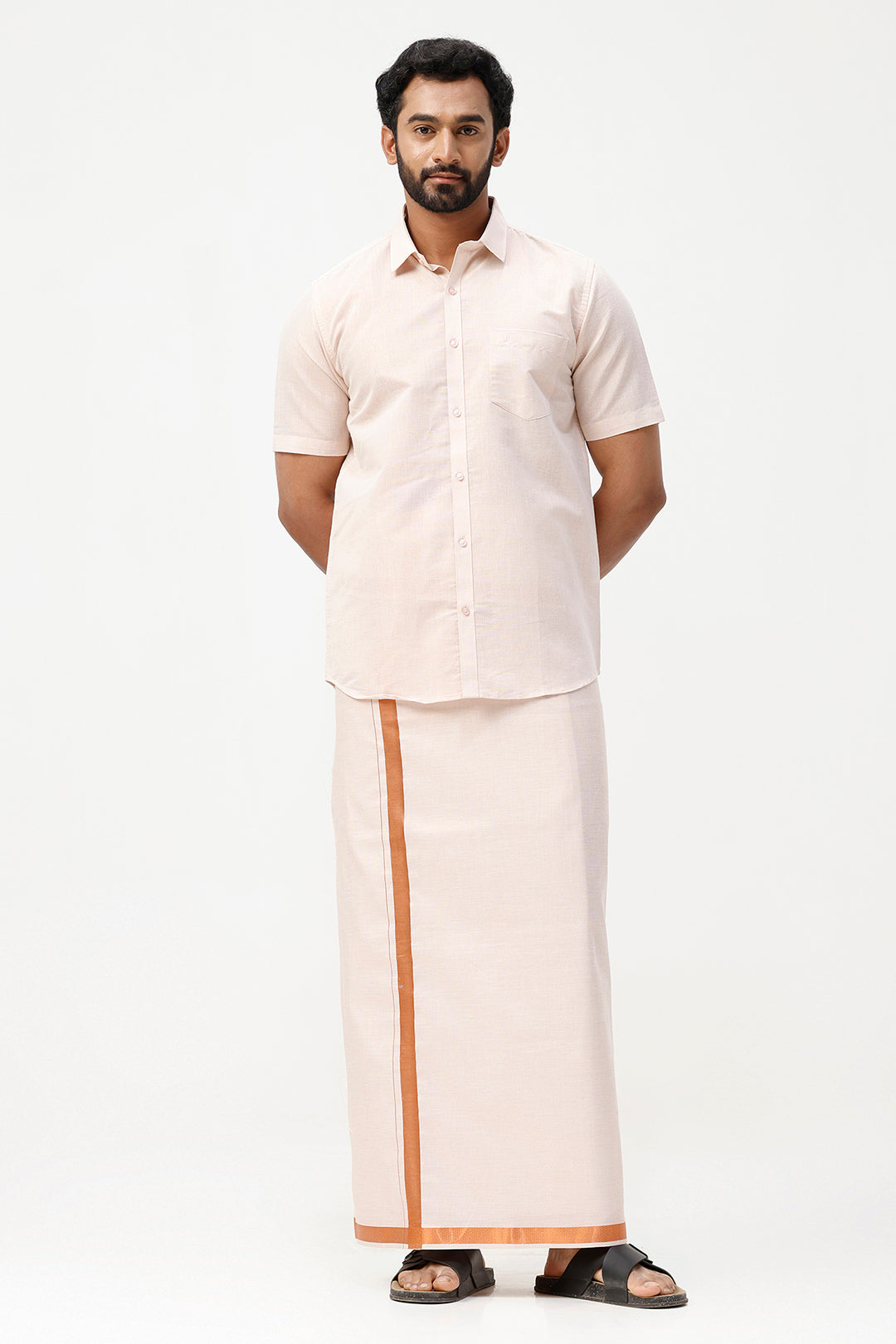Uathayam Copper Orange Vaibhav Shirt and Dhoti Set is Cotton Rich Blend. Dhoti was attractive and jari border colors. It is suitable for everyday wear. Wash only by hand or with a gentle machine. It is not recommended to wash this product with colors. Please do not use blue or bleach. Can be ironed on the borders with mild heating. Make your special day most memorable with our Uathayam Copper Orange Vaibhav Shirt and Dhoti Set.