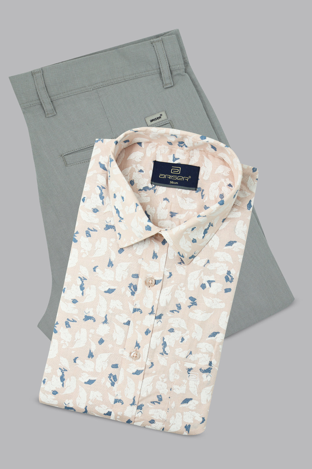 The Vudu + Kansas - Cream Peach Printed Shirt With Dusty Gray Trouser Combo For Men | Ariser brings a refined yet contemporary style, suitable for smart-casual and semi-formal occasions. The Sage Green printed shirt adds a fresh and stylish touch, tailored for a comfortable and flattering fit. Combined with clean white trousers, this combo ensures a sharp, sophisticated look while maintaining all-day comfort and versatility.