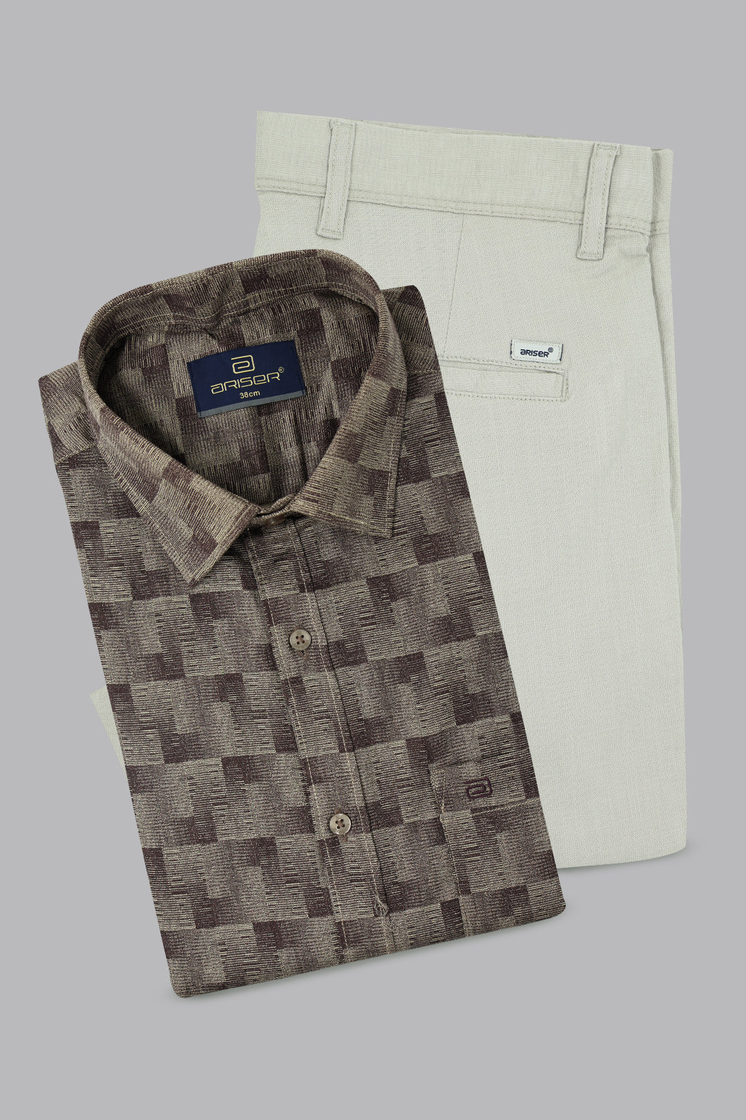 The Vudu + Kansas - Dark Walnut Brown Printed Shirt With Gray Trouser Combo For Men | Ariser brings a refined yet contemporary style, suitable for smart-casual and semi-formal occasions. The dark walnut brown printed shirt adds a fresh, stylish touch, tailored for a comfortable, flattering fit. Combined with clean white trousers, this combo ensures a sharp, sophisticated look while maintaining all-day comfort and versatility.