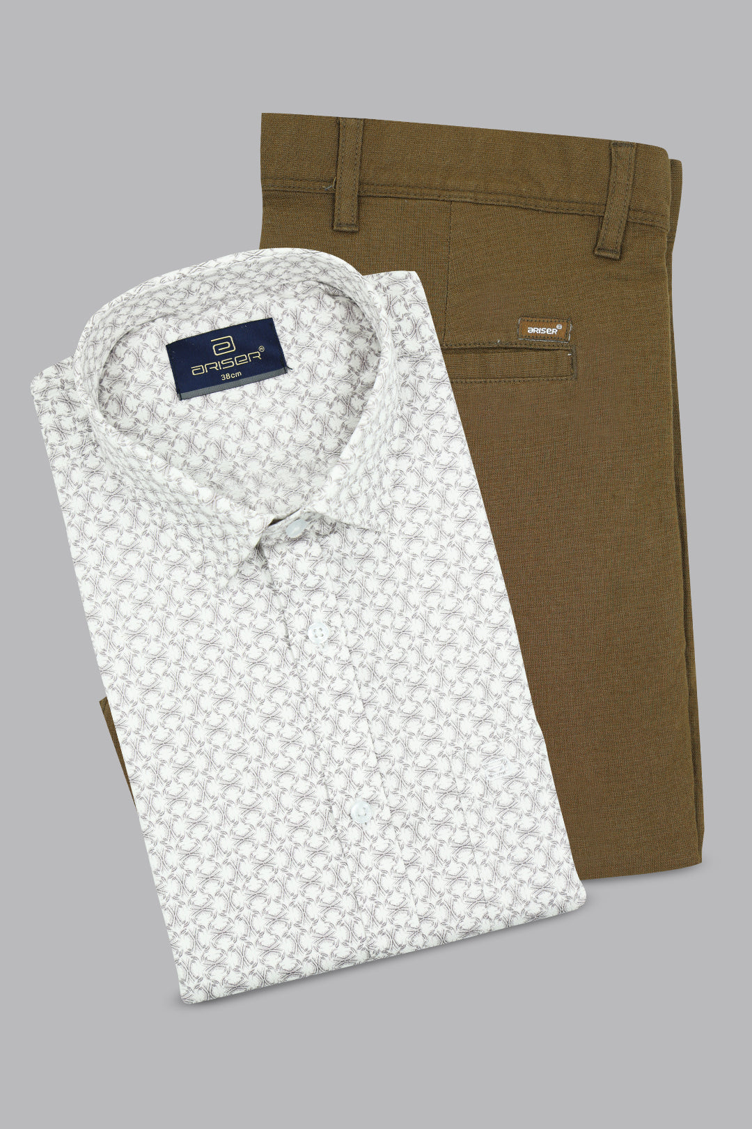 The Vudu + Kansas - Ivory Stone Printed Shirt With Coffee Brown Trouser Combo For Men | Ariser brings a refined yet contemporary style, suitable for smart-casual and semi-formal occasions. The Ivory Stone printed shirt adds a fresh and stylish touch, tailored for a comfortable and flattering fit. Combined with clean white trousers, this combo ensures a sharp, sophisticated look while maintaining all-day comfort and versatility.