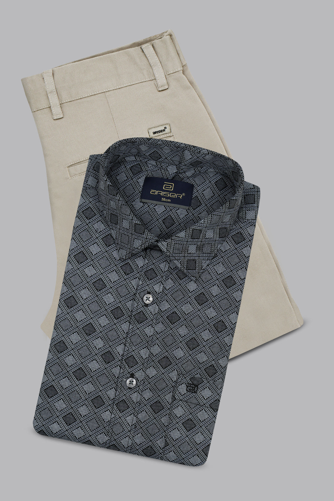 The Vudu + Monaco - Charcoal Black Printed Shirt With Light Gray Trouser Combo For Men | Ariser offers a refined and contemporary look, perfect for both formal and semi-formal occasions. Expertly tailored for a modern, polished appearance, the charcoal black printed shirt delivers a sharp and sophisticated style with a sleek finish. Paired with versatile light gray trousers designed for superior comfort and a structured fit, this combo creates a well-balanced, elegant ensemble. Ideal for office wear, business meetings, evening events, or smart casual outings, this set ensures effortless style with lasting comfort.